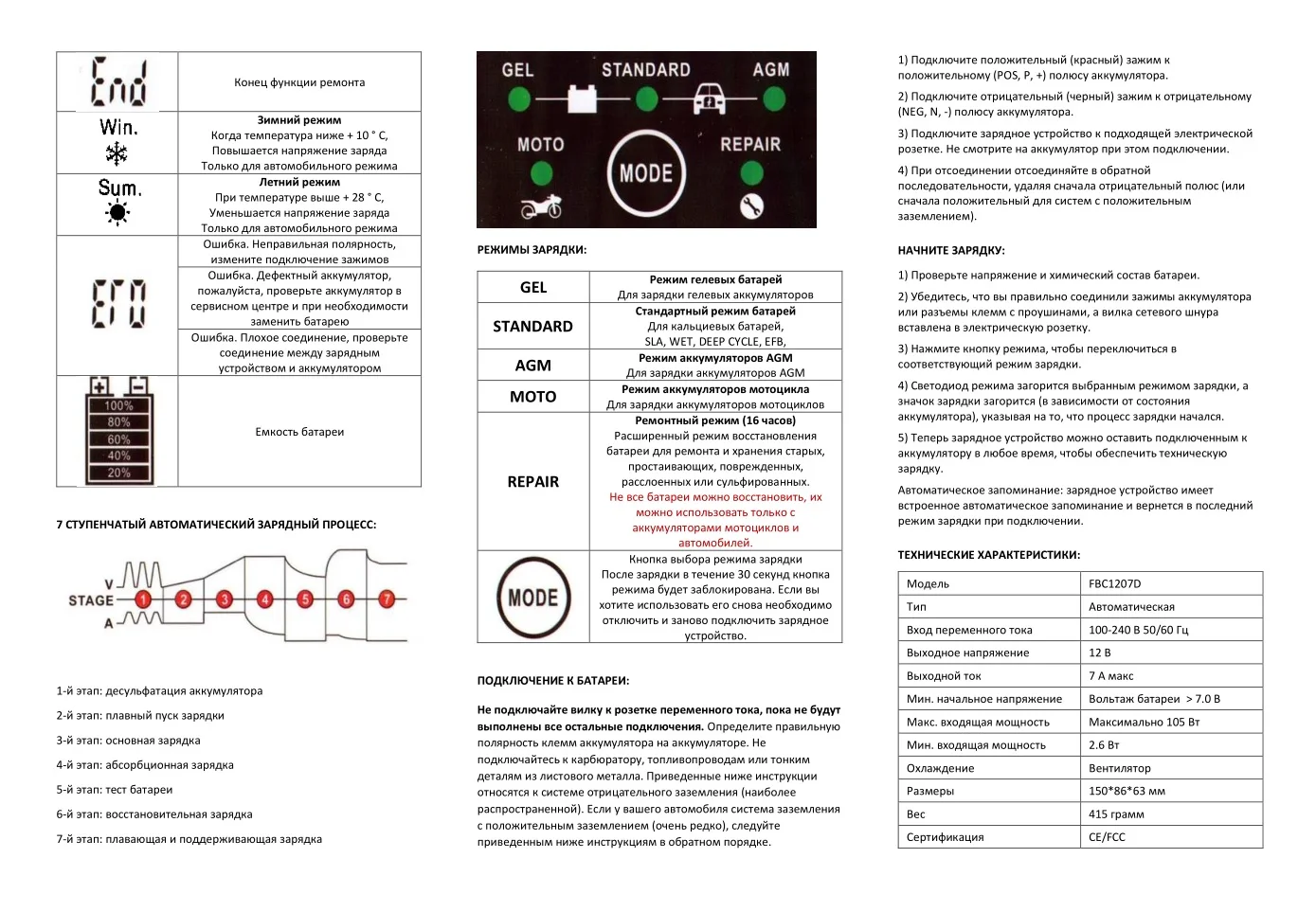 - Зарядное устройство FBC1207D предназначено для аккумуляторов 12 В емкостью от 6 до 120 Ач.