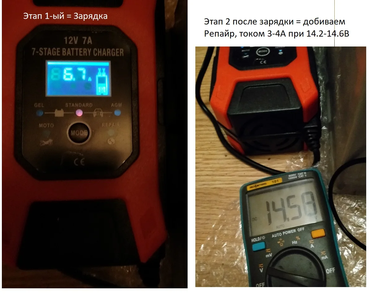 Я использовал это зарядное устройство для 5 лет батареи Varta B33, чтобы зарядить его. Я увидел улучшение внутреннего сопротивления от 11,88 МОЗ до 10 Моз. Это улучшило его емкость от 253A до 300A. Я буду использовать также функцию ремонта, чтобы увидеть, улучшит ли он дальше. Зарядное устройство сначала использует режим десульфатирования в течение 5 первых минут перезарядки, которая быстро изменяет напряжение. Он начинается с высокого тока (6.7A), затем уменьшает его. Я доволен своим использованием.