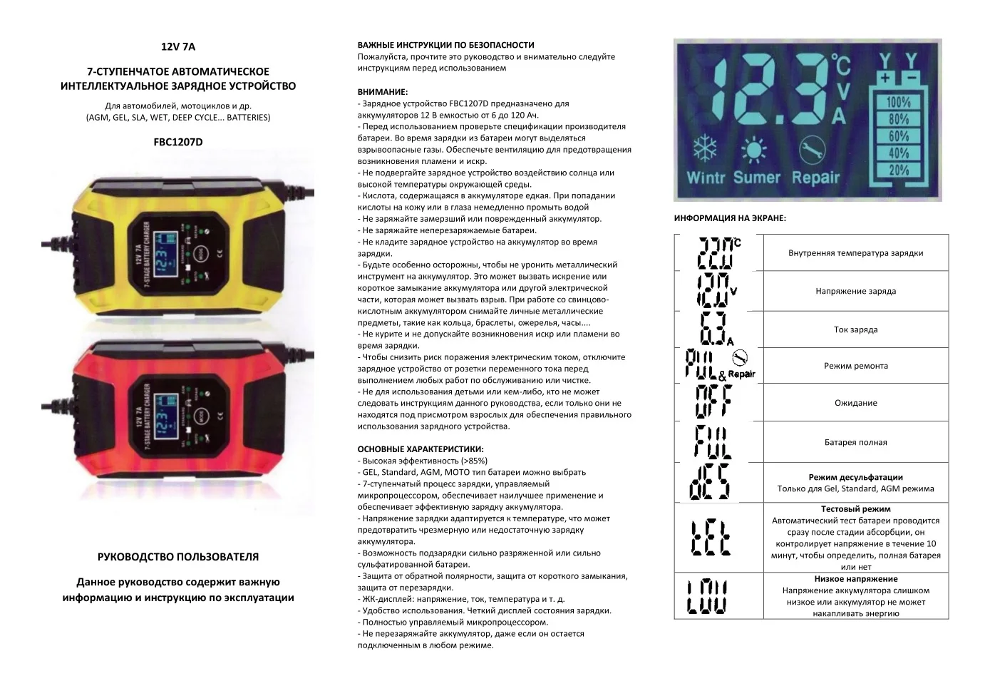 Доставка очень быстрая, до Москвы за 10 дней! Всё целое, коробка не мятая. Имеется инструкция, но без русского языка. Зарядное устройство работает нормально, восстановил и затем зарядил мото аккумулятор 7Ah, который использовался немного,но лежал 2 года без дела. Сейчас показывает 12,4в.