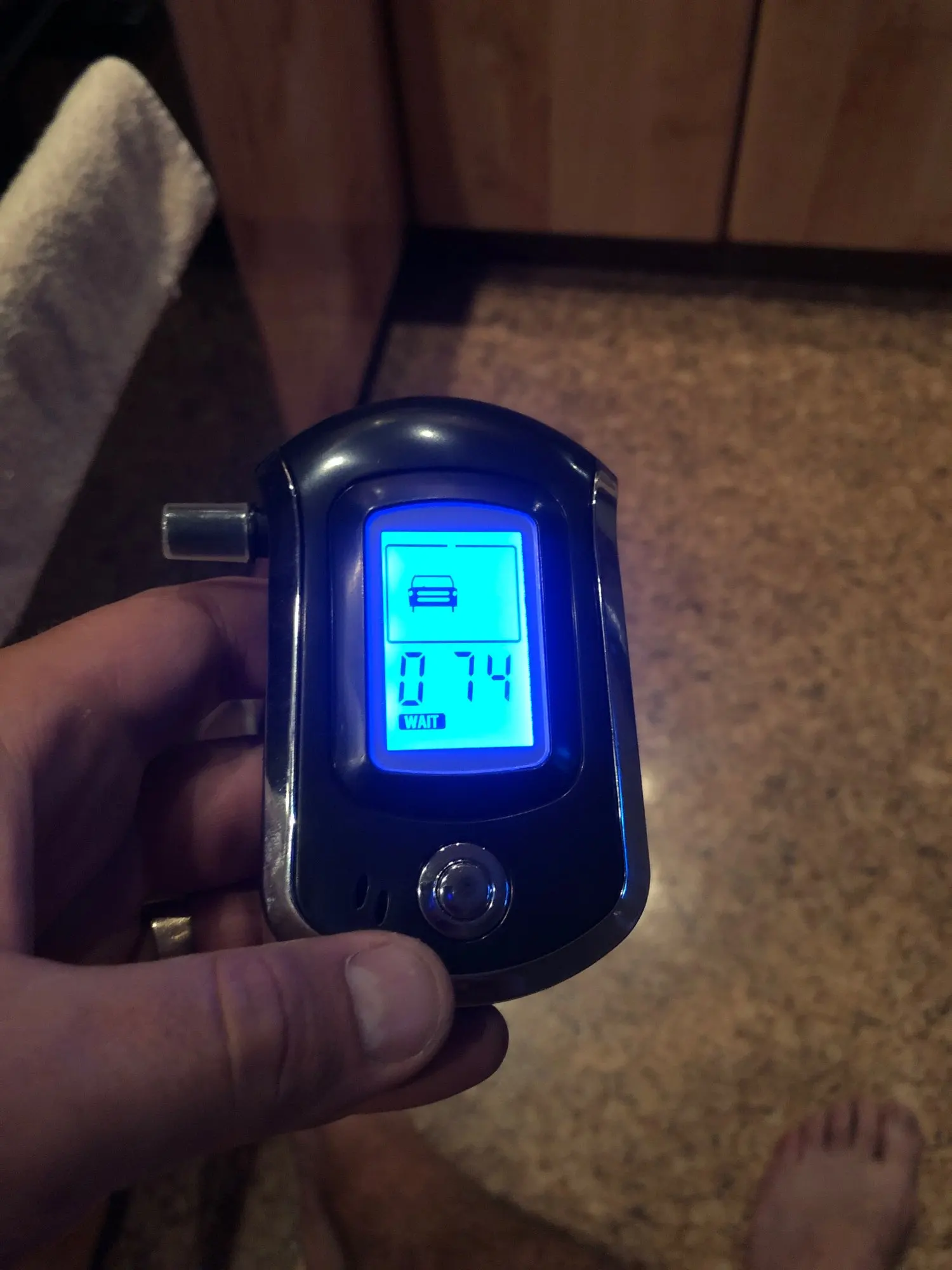 Итак, после нажатия кнопки ВКЛ/ВЫКЛ запускается процесс самодиагностики и подготовки алкотестера к работе. Длится это примерно секунд 15-20, на экране светится надпись «Wait» и отображается обратный отсчет от 100 до 0.