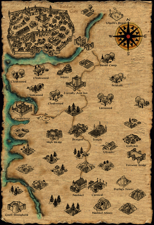 Это стандартный гайд Baldur’s Gate, прохождение подходит для enhanced edition полностью. Игра начинается в крепости Кэндклип: здесь герой может получить справку по игре (от людей в зелёных одеждах), научиться сражаться (в ближайшем от ворот здании сидит маг, способный создать иллюзию противников).