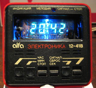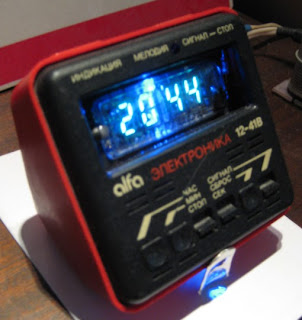 Часы рижского завода РЗПП на микросхеме К1016ХЛ1 и микросхеме мелодий будильника УМС7, индикация индикатор вакуумно-люминесцентный типа ИВЛ2-7/5 .Модель 12-41А была без микросхемы мелодий (см.схему)