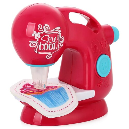 Детская швейная машинка Sew Cool дает возможность ребенку проявить фантазию. Для того чтобы начать работу, нужно всего лишь положить один или два кусочка войлочной ткани на рабочую панель под футляр с иглами, нажать на голубую кнопку «старт», подвигать в двух направлениях ткань и снова нажать на кнопку, чтобы игрушка перестала шить.