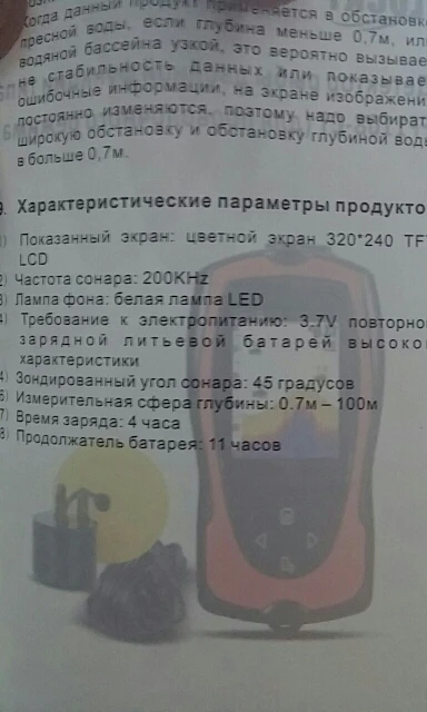 Эхолот как для меня просто супер! Маленький удобный как для зимы самое то. Проверил на льду все работает отлично! Рыбу видит ( балансир тоже видит) глубину показывает температуру воды тоже. Подаёт звуковые сигналы на глубину и на рыбу. Хорошая комплектация есть зарядник от сети и для автомобиля. Аккумулятор держит нормально на средних настройках пол дня проработал заряд даже не чуть не упал думаю на день хватит спокойно. Как будет работать в сильный мороз не знаю было -5 все в норме как написано может работать до -10. Доставка курьером до дома. Рекомендую эхолот и продавца .