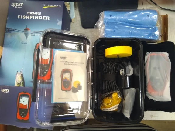 Вот и я стал обладателем данного эхолота! Супер быстрая доставка за 7 дней до двери. Привез курьер. В комплекте с эхолотом идет датчик с поплавком на 8ми метровом кабеле, 2 зарядных устройства(авто и 220в), шнурок, крепление к транцу лодки, зип чехол.