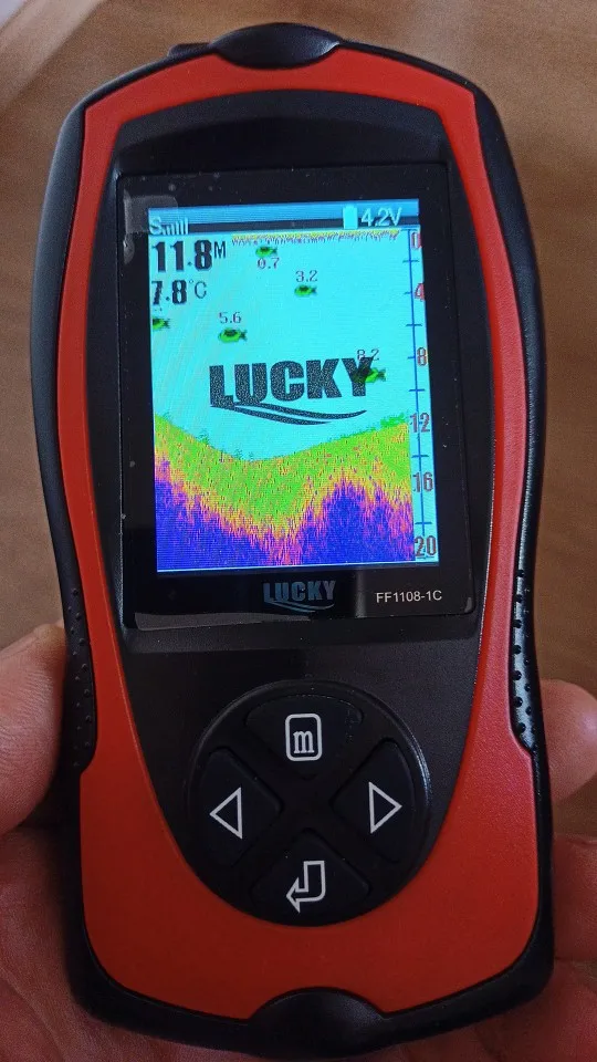 - Работает эхолот Lucky Fish Finder FF1108-1 на глубинах от 0,7 до 100 метров, с погрешностью до 10 см;