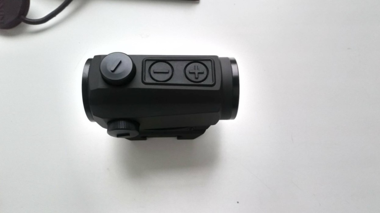 Теперь перейдем непосредственно к изделию. Holosun HS403B представляет собой, как я уже писал, коллиматорный прицел закрытого типа с размером линзы в 22 мм. Линза прицела имеет антибликовое покрытие, и со стороны ствола отливает красным цветом. Линза имеет одну особенность — она не совсем ровно вмонтирована в прицел. В моем случае видны следы проклейки линзы при установке в корпус — не критично, но осадок остался. Забегая вперед, скажу — сейчас настрел с этим прицелом смешной: примерно 700-800 выстрелов. Дальнейшая эксплуатация покажет, во что выльется данный дефект, но успокаивает пожизненная гарантия производителя.