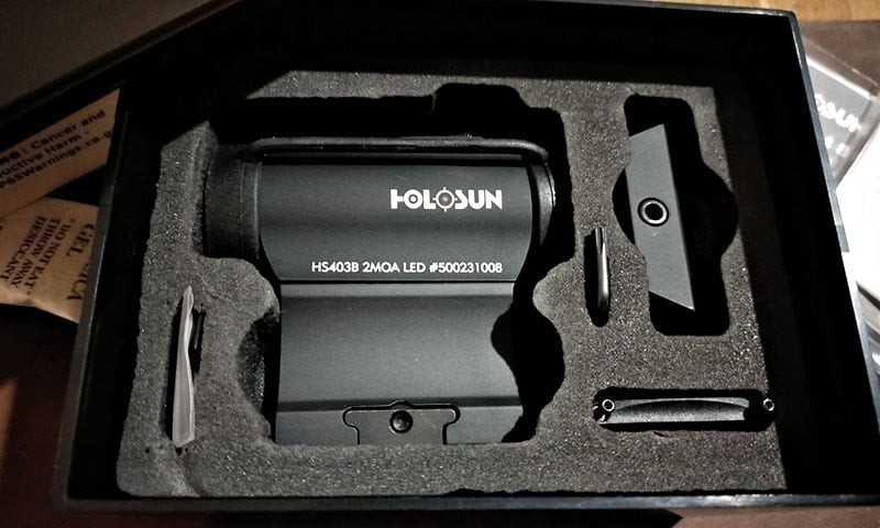 Недавно один мой друг продавал новый прицел Holosun HS403B, по цене намного ниже рыночной стоимости. Этот прицел компания прислала ему в замену сломавшемуся (у данного производителя пожизненная гарантия на все изделия, при условии, что «смерть» прибора наступила естественным путем), но товарищ решил, что на данном этапе ему нужнее патроны. Поэтому прицел достался мне.