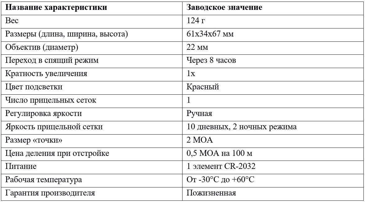 У данной модели прицельная марка — только точка в 2 угловые минуты, т.е. закрывает цель размером 6 см на дальности 100 метров.