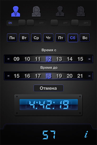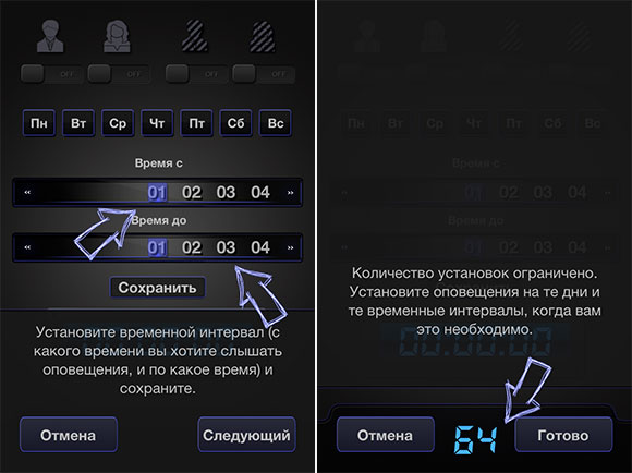 Логика интерфейса простая: выбираете день недели, время с которого начать озвучивать каждый час, и время, по которое это делать. Одновременно с прокруткой времени в верхней шкале происходит прокрутка и в нижней, то есть назначить «время с