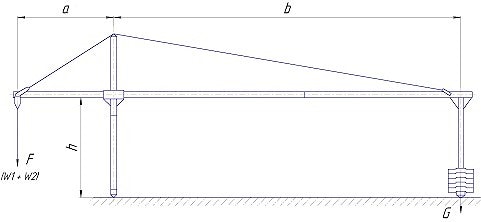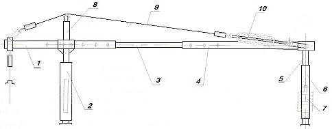 5- соединительный элемент. 6- задняя опора. 7- противовес (балласт). 8- верхняя опора. 9- трос. 10- натяжной винт (талреп).