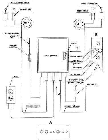 Оборудование состоит из устройств для подвешивания платформы, рабочей платформы, подъемных механизмов, ловителей, кабеля, канатов, электрошкафа и электрической системы управления.