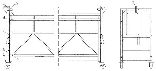 Рабочая платформа состоит из трех основных секций и двух подъемных кареток, по одной на каждой стороне. Каждая основная секция включает в себя более высокий передний поручень, более низкий задний поручень (со стороны фасада здания) и плиту основания.