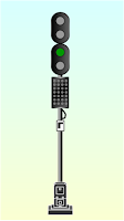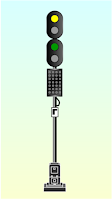 4) один зелёный мигающий и один жёлтый огни и две зелёные светящиеся полосы — разрешается поезду следовать на железнодорожную станцию со скоростью не более 120 км/ч на боковой железнодорожный путь; следующий светофор открыт и разрешает проследование его с установленной скоростью (рис. 11);