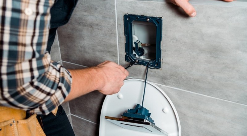 После окончания монтажа инсталляции совершается переход от сантехнических работ к общестроительным. Все элементы системы, а также инженерные коммуникации прячутся за фальшстеной, защитным экраном или в коробе. Приоритетный вариант — перегородка из ГКЛ от пола до потолка. Для ее установки по стенам и стяжке крепится направляющий металлический профиль.