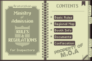 «Правила и Нормативы для инспекторов» Министерства Въезда Арстотцки (или же инструкция) — это справочное пособие, включающий иммиграционный протокол, списки действительных документов и их печати, а также информацию о других странах: их расположение на карте, .