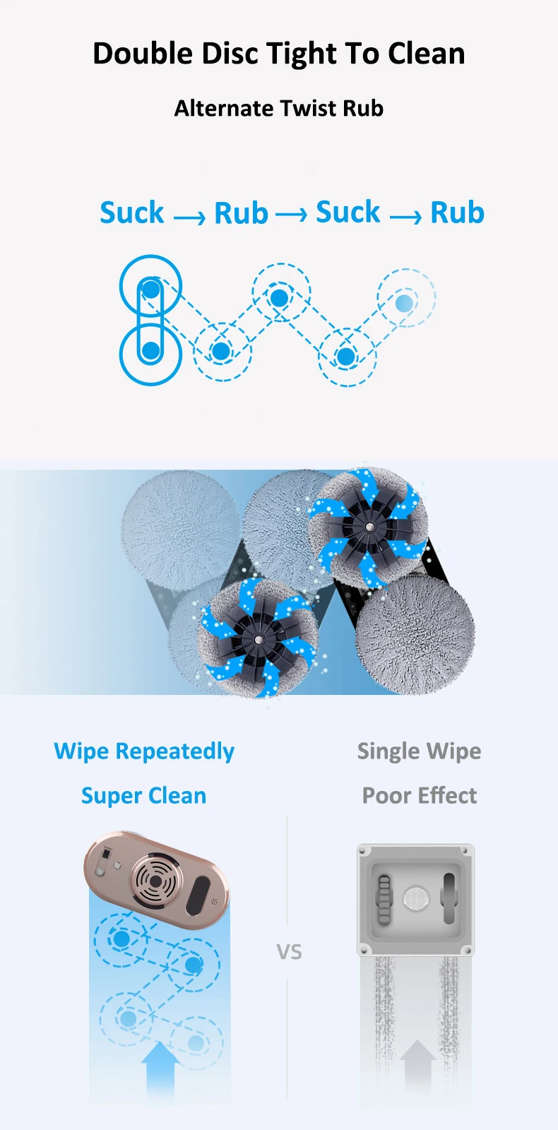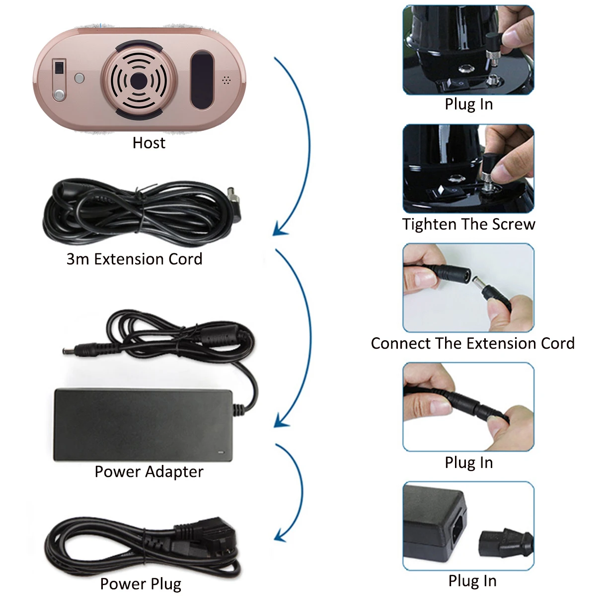 1, необходимо подключить, а не для зарядки. Этот нельзя использовать для зарядки. Пожалуйста, заряжайте в течение 30-60 минут перед использованием Firsr.2, Пожалуйста, подключите кабель питания и Удлинительный кабель соответствующим образом, затяните разъем питания, в противном случае вы получите сигнал тревоги.3, робот останется в winbadows в течение 30 минут после отключения питания, пожалуйста, снимите его вовремя4, подождите 20 секунд после запуска, пока синий светильник не прекратит мигать, затем начните работать. Потому что роботу нужно 20 сек, чтобы обнаружить стеклянную плоскость.5, привязать веревку безопасности при использовании, предотвратить падение с большой высоты. 6. Распылите воду на кромке клеящих швабры при работе, будет лучше работать