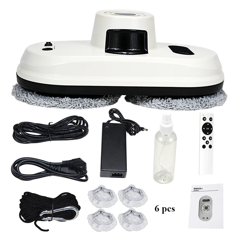 1 х робот для очистки окон,1 х шнур питания1 х адаптер питания1 пульт дистанционного управления.1 X удлинитель (4 м).1 х Веревка безопасности,6 чистящих салфеток1 бутылка для воды.1 х руководство на английском языке.