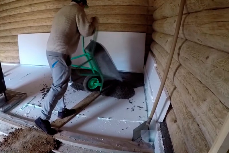 Следующий этап — укладка теплоизолятора. В данном случае в качестве утеплителя следует применять материал, способный выдерживать нагрузки. Дешевле всего использовать керамзит, но нужно учесть, что теплопроводность у него не самая низкая. Более эффективный вариант — экструдированный пенополистирол, который и стоит несколько дороже.