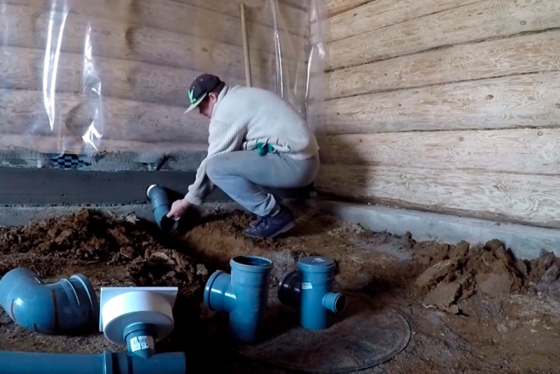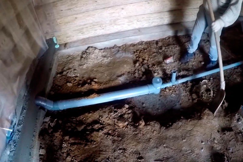 Чтобы выставить трубу и трап на нужную высоту, под них нужно подкладывать деревянные подкладки или утеплитель.