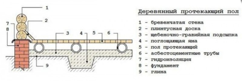 Протекающий пол поверх бетонного основания. 1. Грунт. 2. Керамзитобетон. 3. Цементная стяжка. 4. Желоб. 5. Кирпичный столбик. 6. Гидроизоляция. 7. Лаги. 8. Доска половая