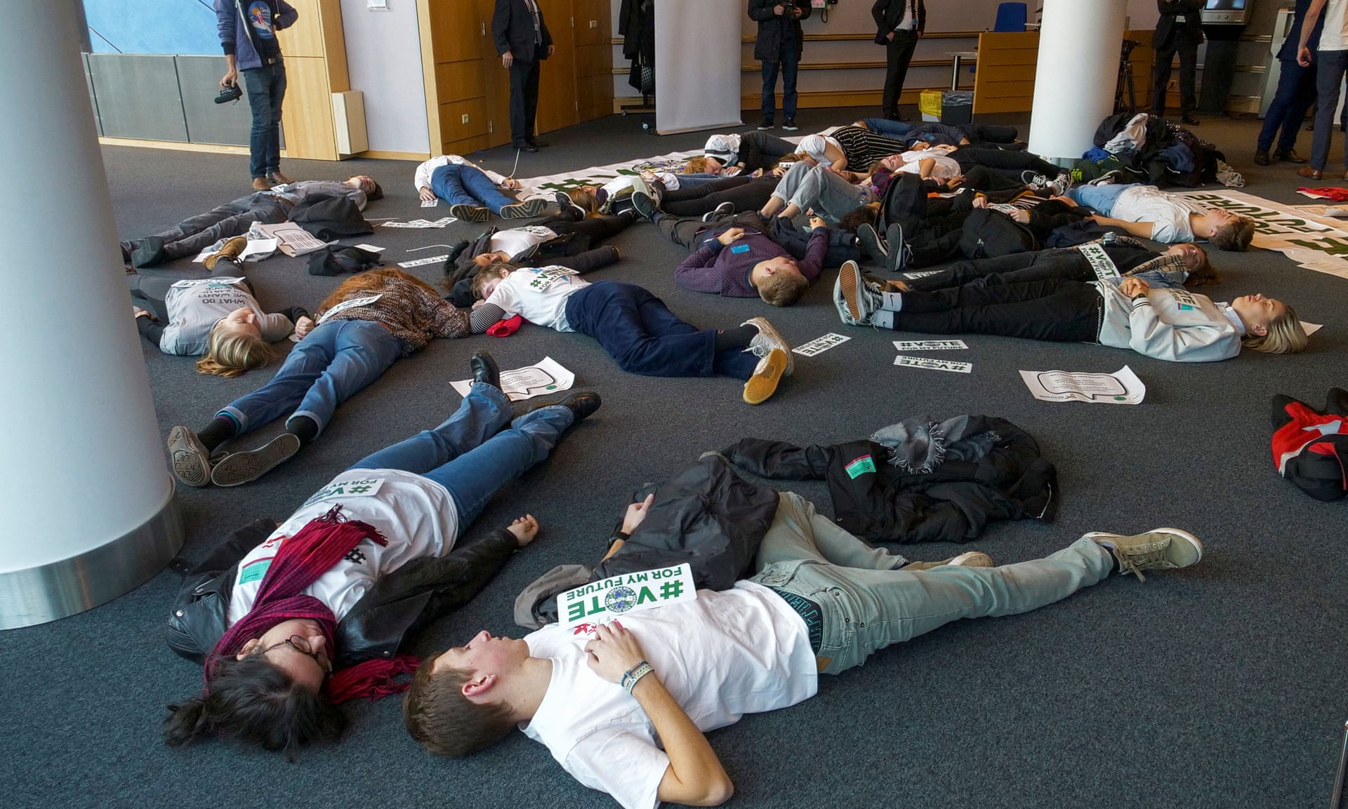 Климатическая акция в Европарламенте — зеленые активисты требуют спасти мир от изменения климата, иначе мы все погибнет