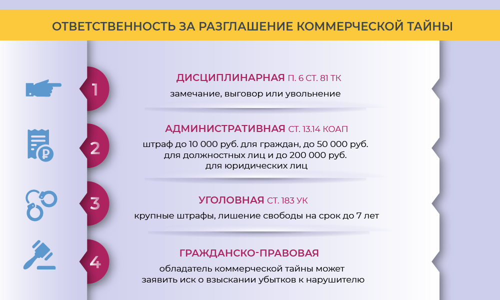 Это минимум из того, что положено по закону. Если пропустить хотя бы один из пунктов, суд потом может решить, что режим коммерческой тайны был установлен неправильно, и привлечь работника к ответственности за разглашение не получится. Исполнение всех этих требований — это не право обладателя коммерческой тайны, а его прямая обязанность.