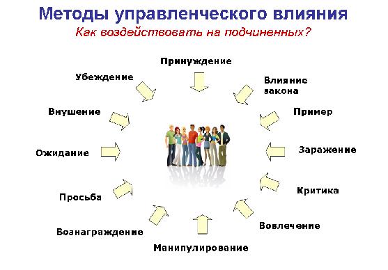 Влияние — это любое поведение одного индивида, вносящее изменения в поведение, отношения, ощущения другого индивида. Конкретные средства, с помощью которых одно лицо может влиять на других, могут быть самыми разнообразными: просьба, угроза увольнения и т.п.