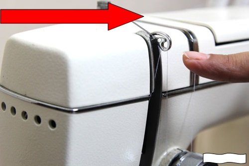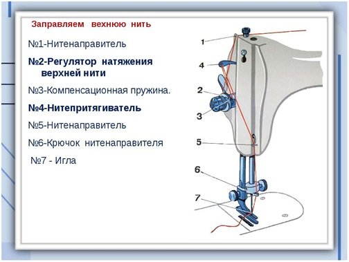 - Заправка верхней нити через первый нитенаправитель, нитенатяжитель, второй нитенаправитель к игле.