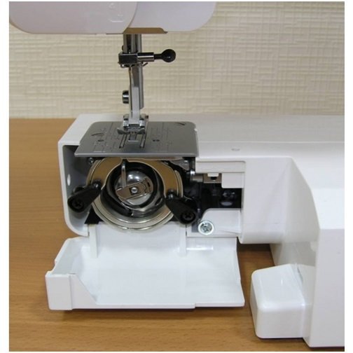 В нижней части швейной машинки находится небольшая шпулька, подающая вторую нить к иголке. Найти ее можно под металлической пластиной под иглой. Шпулька высвобождается при помощи рычага или кнопки. Она нужна для заправки второй нити.