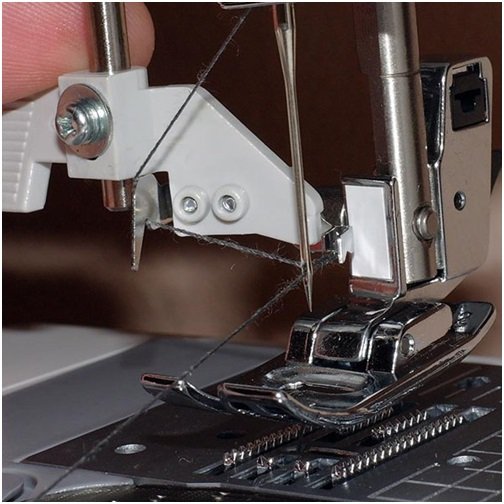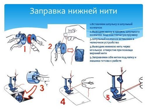 . Во всех машинках используются верхняя нить и нижняя. Нитки в катушке необходимо поместить на верхний катушкодержатель, далее нить проходит через нитенаправитель к лапке и в итоге вставляется в иголку. Нижнюю нить нужно расположить внутри шпульки в нижней части машинки: нитка наматывается с главной катушки при помощи нитепритягивателя на шпульку. Для наматывания нити нужно запустить механизм наматывания, когда процесс будет завершен, он автоматически выключиться. Готовую к работе шпульку нужно поместить в пространство под иглой, а кончик нити оставить снаружи.