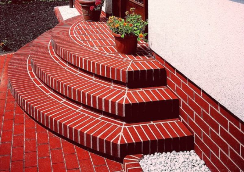 Более красивый, но сложный вариант. Расчет высоты и длины ступеней ничем не отличается от вышеописанного, изменяется сама технология кладки. Рекомендуем для такого крыльца использовать полнотелый облицовочный кирпич, класть его на ребро тычком наружу. По размерам кирпичи дают возможность делать ступени нормированных значений, работы значительно упрощаются и ускоряются. Облицовка полукруглых ступеней керамическими плитками намного сложнее, чем прямоугольных. Работы могут делать лишь профессиональные плиточники, имеющие не только большой практический опыт, но и полный комплект специальных инструментов и приспособлений.
