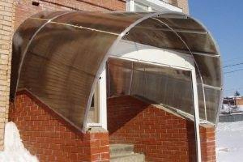 Когда крыльцо из кирпича будет полностью выстроено, останется еще один, последний этап оформления строения — возведение козырька. По размерам крыша должна быть большей от крыльца. Таким образом удастся предотвратить попадание осадков на порожек, а лишняя грязь не занесется в дом. Для основы козырька рекомендуется использовать светопроницаемые и крепкие листы поликарбоната. Края крыльца с козырьком для удобства можно дополнительно оборудовать перилами.