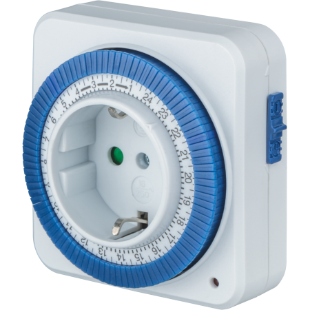 Розетка с дисковым таймером механическая программируется при помощи вращающегося исполнительного диска и кнопок (лепестков), размещённых по его окружности. На диске нанесены риски с 15 или 30 минутными интервалами. При помощи кнопок можно включать и отключать нагрузку. Выпускаются модели, у которых поднятая кнопка будет отключать, у других – наоборот. На боку таймера есть кнопка для переключения режима работы – непрерывная подача напряжения и регулируемая.