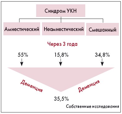 Так, в проведенных собственных исследованиях отдела возрастной физиологии и патологии нервной системы ГУ «Институт геронтологии им. Д.Ф. Чеботарева НАМН Украины» под руководством профессора Н.Ю. Бачинской было показано, что через 3 года синдром УКН развивается до уровня деменции в 35,5% случаев (рис. 1).