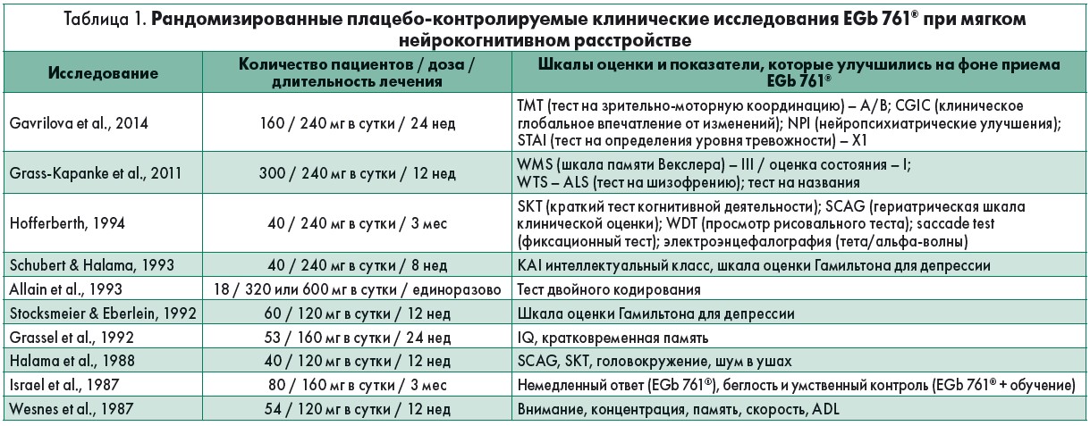 Также были представлены результаты других рандомизированных плацебо-контролируемых двойных слепых многоцентровых исследований EGb 761® при мягком когнитивном расстройстве, которые представлены в таблице 1.