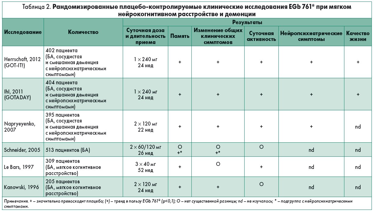 Рандомизированные плацебо-контролируемые клинические исследования EGb 761® при мягком нейрокогнитивном расстройстве и деменции представлены в таблице 2.